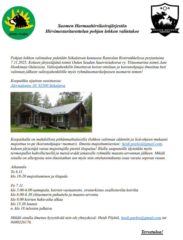 7.11.2025 Siikalatva, Rantsilan Ristironkkeli, järj. Oulun seudun suurriistakoirat ry, Suomen harmaahirvikoirajärjestö ry, ylit. Honkimaa Jani, ilm. 17.10.-1. 11. Pöykiö Heidi, p. 0400326176,…